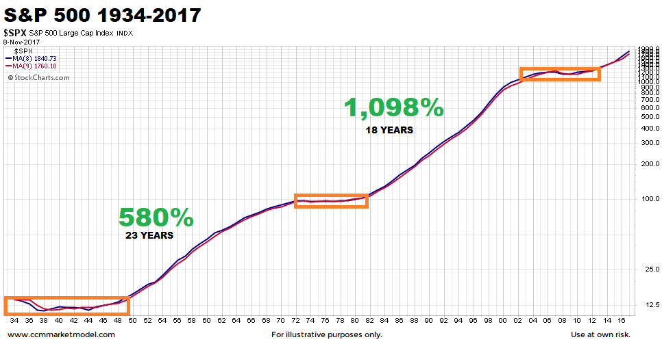 The baby boomers were 22-29 years old when a secular trend began in the stock market in 1982; the trend lasted 18 years. In 2017, the millennials were 13-35 years old. The demographics and chart patterns shown below tell us to keep an open mind about better than expected outcomes in the stock market over the next 5 to 20 years.